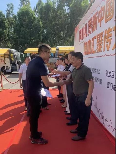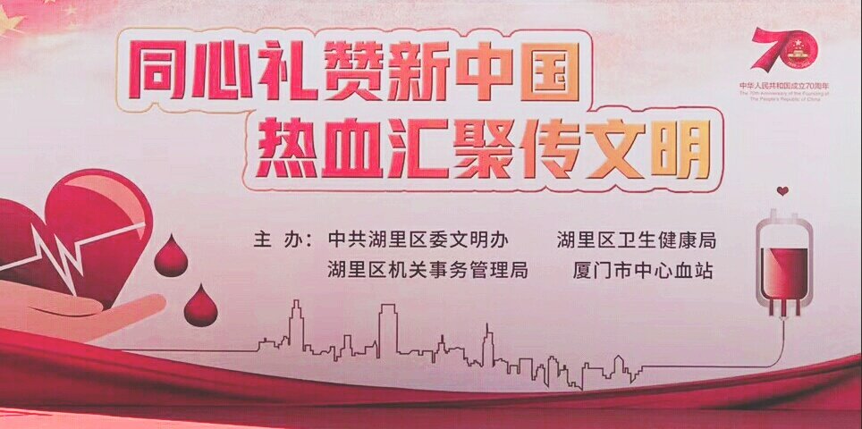 2019年9月19日上午,區(qū)委文明辦、區(qū)衛(wèi)健局、區(qū)機(jī)關(guān)事務(wù)管理局在區(qū)行政中心東附樓機(jī)關(guān)食堂南門前,開展湖里區(qū)“同心禮贊新中國、熱血匯聚傳文明”無償獻(xiàn)血活動(dòng)。