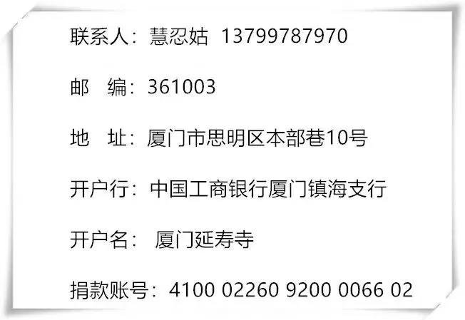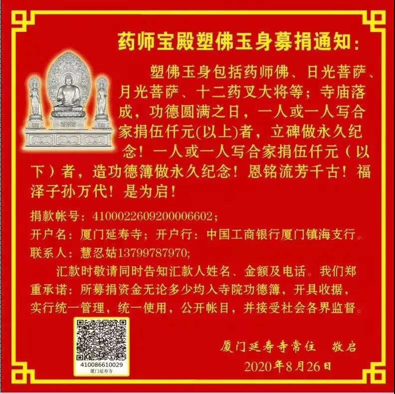 欣逢盛世,佛法興隆?,F(xiàn)任住持慧忍姑悲愿弘深,發(fā)心重建古寺。經(jīng)政府有關(guān)部門批準(zhǔn)同意,延壽寺易地遷建,選址于思明區(qū)大厝山。寺院重建項目包括山門、藥師寶殿、綜合樓(藏經(jīng)閣、延壽堂)等;以及塑佛玉身包括藥師佛、日光菩薩、月光菩薩、十二藥叉護(hù)法等。以道場莊嚴(yán)國土,行妙法慈濟(jì)有情。道場莊嚴(yán),非少力之所能成就;今道場施工建設(shè)中費用大,資金緊缺!施主洪福,仰仗諸佛威光庇佑。啟建道場,盛舉在即。懇請十方大德、檀越善信,社會賢達(dá)、慈善人士、慷慨解囊,鼎力捐助,同種福田,共同成就藥師道場,使延壽寺更好地造福大眾、促進(jìn)文化傳承與社會和諧做出力所能及的貢獻(xiàn)。共同祈愿祖國繁榮昌盛!國泰民安!世界和平!風(fēng)調(diào)雨順!