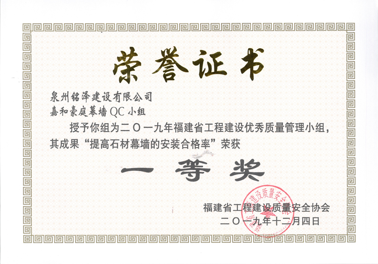 銘澤嘉和豪庭幕墻QC小組榮獲一等獎